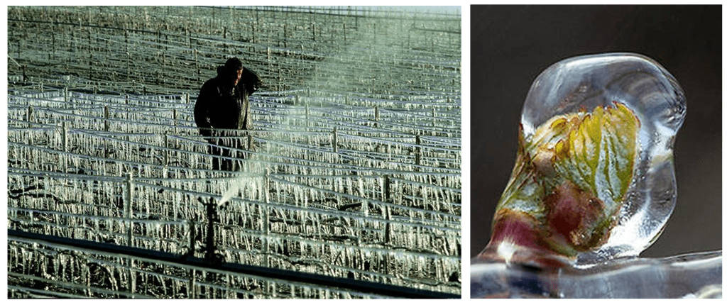 - 基本功效:對葡萄藤持續灑水,待水轉化為冰,並釋放熱能使葡萄藤及芽眼維持0°C進收保護功效。