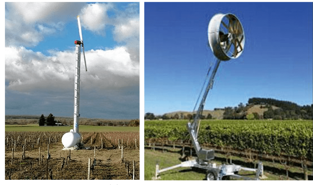 - 缺點:噪音大、潛在維護問題;葡萄園地形差異可能影響效能;當風力超過10公里/小時(行動式為8公里/小時)即失效,且對「黑霜」及「氣流凝結」霜降無效;固定式會破壞風景、行動式則有收納問題。