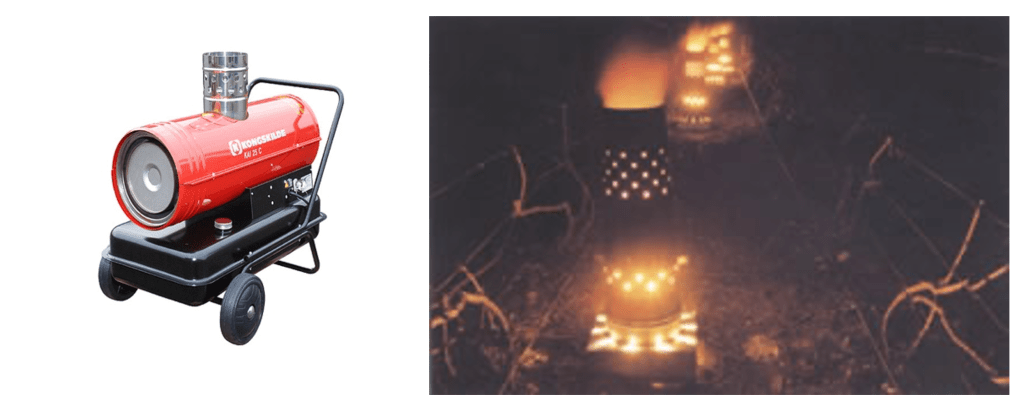- 基本功效:以燃燒瓦斯產生熱量。前者適用小面積地塊,將機器置於葡萄園中心,以每小時消耗10.5公斤瓦斯,供應周遭2~7°C熱能;後者適用至多8公頃土地,以40公斤/小時瓦斯消耗量在園中來回運作,即可供給1~2°C熱能。