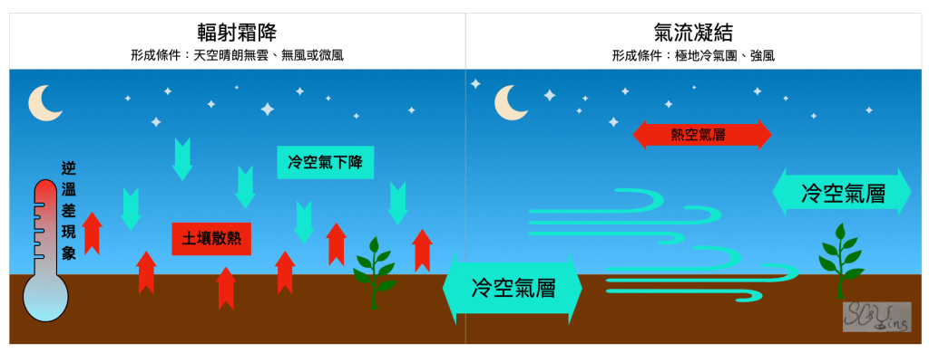 作為整起事件的主角,科普一下霜害是必須的。根據文獻記載,一般俗稱的霜害其實可以歸因於兩種不同的氣候現象所造成的損傷,分別是「輻射霜降(Radiational Frost Event)」與「氣流凝結(Advective Freeze )」,兩種現象有可能同時出現,但必定有其中一個是作為主要影響者。