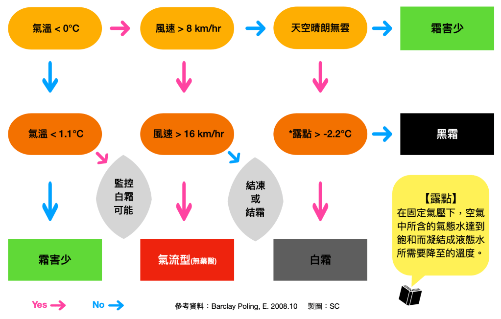 由於面對不同的結霜型態有不同的作戰策略,故在法國通常霜降警報發佈後,酒農的判斷流程大致可用下圖說明: