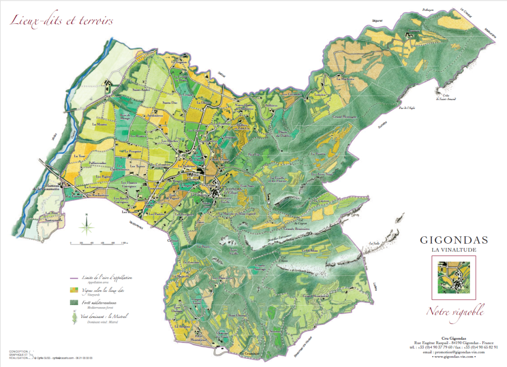 吉貢達斯(Gigondas)位於南隆河谷沃克茲省(Vaucluse),是個居民僅六個百餘人的小村莊。村莊東部為隆河谷知名的觀光景點Dentelles de Montmirail峭壁,葡萄園多分佈於村莊核心以西的平原地帶,乾燥炎熱非常適合種植紅葡萄品種,只有零星葡萄園穿插在150-400米間的山谷坡地,其涼爽氣候相當有利白葡萄生長。 1971年吉貢達斯法定產區成立時,酒農們申請了三種酒款的產區使用權,但最後只有紅酒與粉紅酒被核定,白酒必須降級為「隆河谷法定產區 (Côte du Rhône) 」,在經濟考量下,許多原種植白葡萄的地塊都被拔除改种红葡萄品種。是以至今,吉貢達斯村近1200公頃的葡萄園中僅有約16公頃生產白葡萄酒。